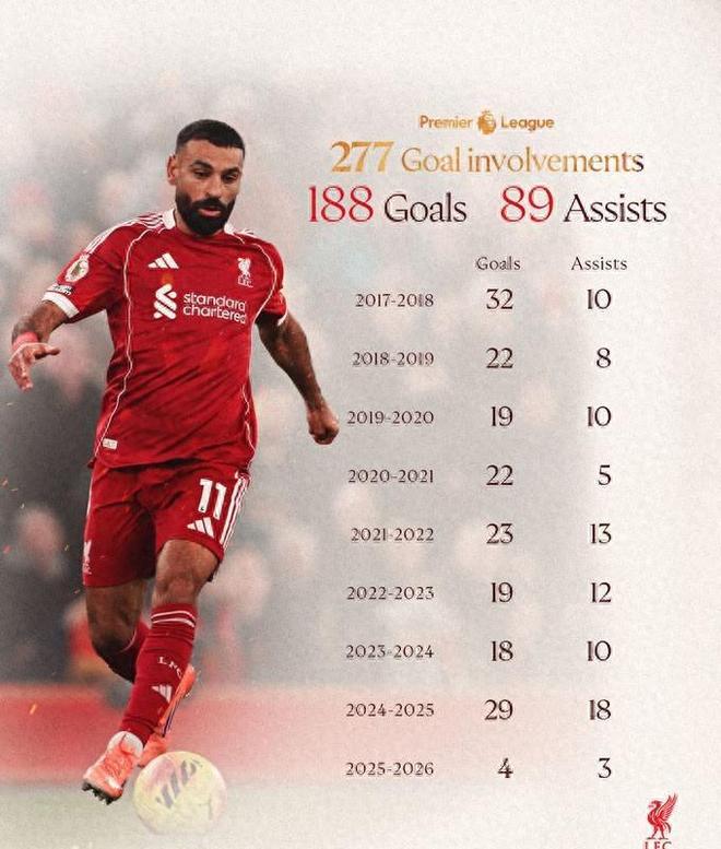 萨拉赫复出后创造了一项纪录,超越鲁尼,成为英超单家具乐部进球第一人。 2025/26赛季英超第16轮,利物浦主场2-0击败布莱顿。虽然本场比赛两粒进球都是雨果·埃基蒂奇打进的,但比赛的焦点无疑属于刚刚伤愈复出的埃及球星萨拉赫。此前因缺席欧冠对阵国际米兰的比赛而受到关注的萨拉赫本场比赛没有首发,而是坐在了替补席上。然而,比赛进行到第26分钟,乔·戈麦斯因伤被迫离场,而萨拉赫却意外到来。他的出现立刻点燃了安菲尔德,成千上万的球迷起立为他鼓掌。尽管萨拉赫尚未恢复最佳状态,全场比赛未能取得进球,但他仍然凭借精准的角球帮助埃基蒂奇打入第二球,为球队的胜利增添了关键。更重要的是,有了这个帮助p,萨拉赫职业生涯直接参与了利物浦在英超的277粒进球(188球+89助攻),正式超越鲁尼为曼联贡献的276粒进球(183球+93助攻),成为英超历史上为单家具乐部进球最多的球员。值得一提的是,如果算上萨拉赫早年在切尔西的贡献,他在英超历史上已经参与了280个进球,排名第三。排在他前面的球员只有阿兰·希勒(324 次)和韦恩·鲁尼(311 次)。这一里程碑不仅凸显了萨拉赫在利物浦历史上的重要地位,也再次证实了他作为英超首席攻击手的持续影响力。